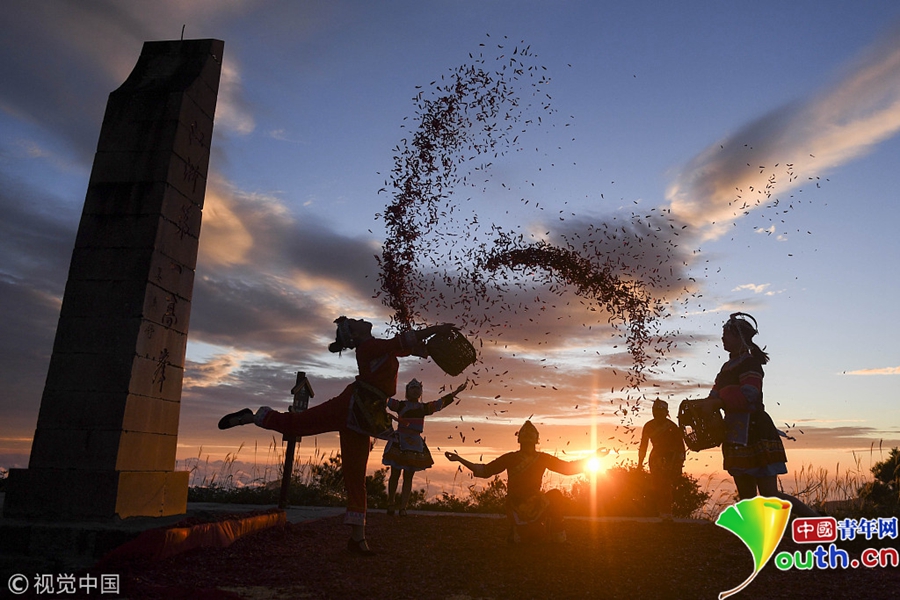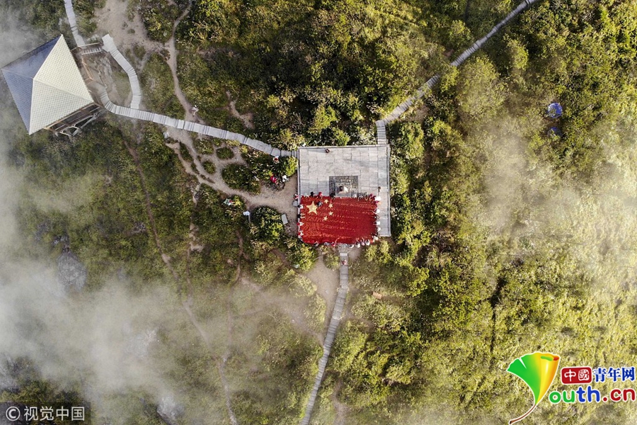 中國青年網北京9月26日電 9月26日,長三角第一高峰浙江龍泉山農作物喜獲豐收,當地農民與游客用8噸剛收獲的辣椒以及玉米,在山頂的云海中拼出了一面長10米、寬6.6米的巨型國旗慶祝豐收。圖片來源:視覺中國