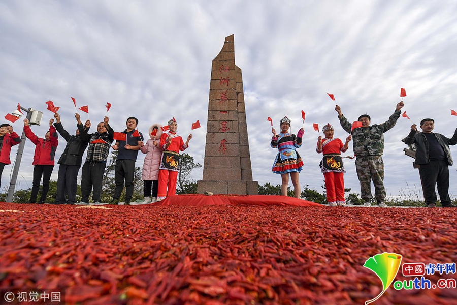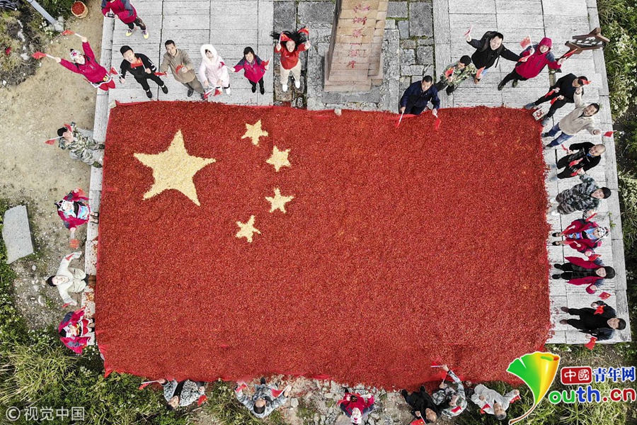 9月26日,長三角第一高峰浙江龍泉山農作物喜獲豐收,當地農民與游客用8噸剛收獲的辣椒以及玉米,在山頂的云海中拼出了一面長10米、寬6.6米的巨型國旗慶祝豐收。