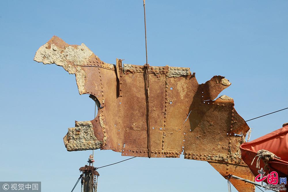 2018年9月25日,遼寧大連,考古工作人員把一片“經遠艦”裝甲進行吊裝轉運。視覺中國