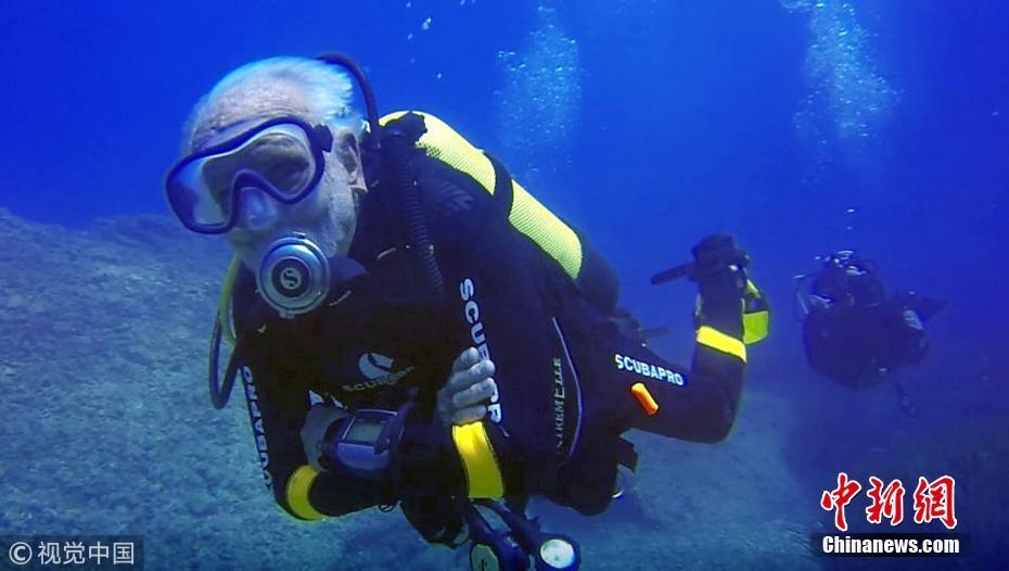當(dāng)?shù)貢r(shí)間2018年9月1日,塞浦路斯,95歲的英國潛水員雷·伍利(Ray Woolley)以44分鐘下潛40.5米的成績(jī)打破了自己94歲達(dá)成的記錄(41分鐘下潛38.1米),二度刷新了世界上年齡最大的男性潛水員最好成績(jī)。在此次下潛中,這位二戰(zhàn)退伍老兵對(duì)距塞浦路斯南部城鎮(zhèn)拉納卡約2公里處的海域進(jìn)行了探索,1980年一艘名為“芝諾比亞號(hào)”(Zenobia)的貨船在這里進(jìn)行首次航行時(shí)沉沒。圖片來源:視覺中國
