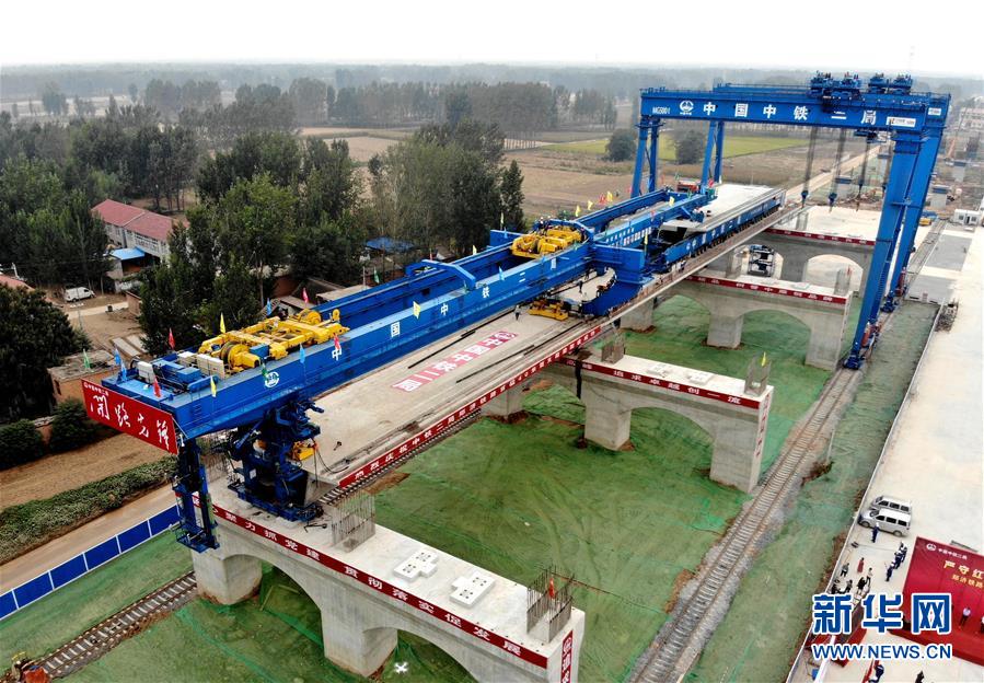 9月27日,中鐵二局的施工人員使用大型機械在鄭(州)濟(南)高速鐵路(鄭濮段)站前工程VI標施工現(xiàn)場架設40米簡支箱梁(無人機拍攝)。 新華社記者李安攝