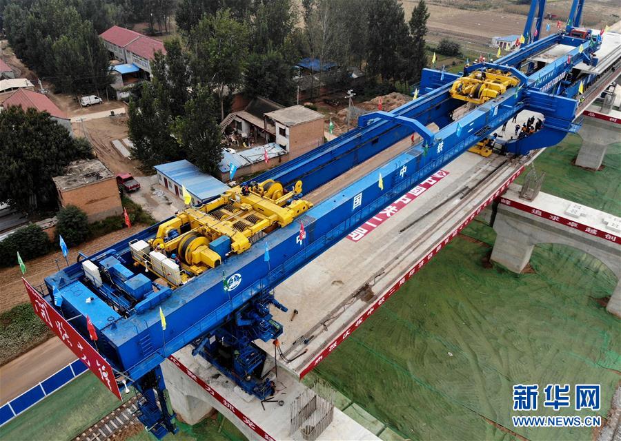 9月27日,中鐵二局的施工人員使用大型機(jī)械在鄭(州)濟(jì)(南)高速鐵路(鄭濮段)站前工程VI標(biāo)施工現(xiàn)場(chǎng)架設(shè)40米簡(jiǎn)支箱梁(無(wú)人機(jī)拍攝)。 新華社記者李安攝
