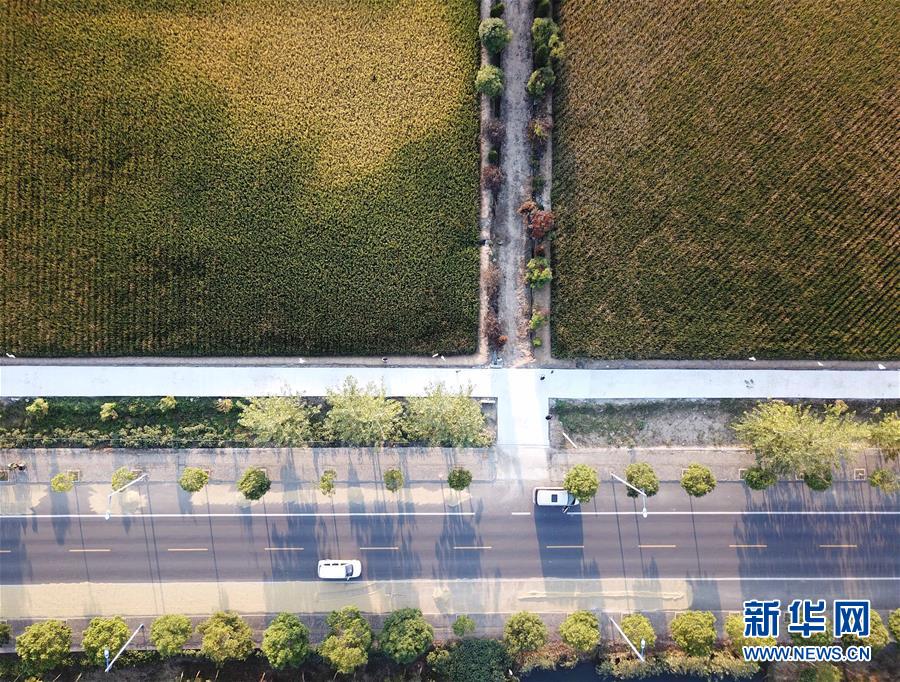 這是小崗村的稻田及公路(9月26日無人機拍攝)。