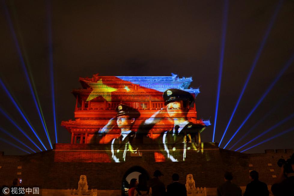 永定門(mén)城樓南廣場(chǎng)舉辦的“我愛(ài)你中國(guó)”迎國(guó)慶燈光秀于2018年9月28日晚正式向市民首秀。即日起至10月7日,每晚這里都將啟動(dòng)燈光表演。