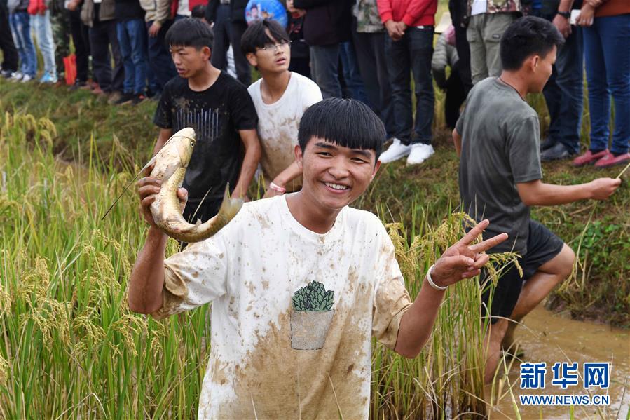 9月29日,一名小伙子展示摸到的魚。9月29日,云南省尋甸回族彝族自治縣2018年首屆農(nóng)民豐收節(jié)暨第二屆摸魚節(jié)在雞街鎮(zhèn)舉行,當(dāng)?shù)剞r(nóng)民和游客在豐收的稻田里進(jìn)行摸魚、拔谷穗、山歌對唱等活動,享受收獲的喜悅。新華社記者楊宗友攝