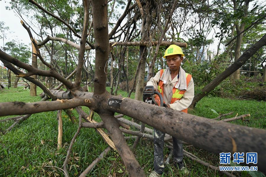 10月1日,工作人員在深圳街頭的綠化帶清理強臺風“山竹”損毀的樹木。當日是國慶節(jié),許多勞動者堅守在工作一線,在崗位上度過節(jié)日。新華社記者毛思倩攝