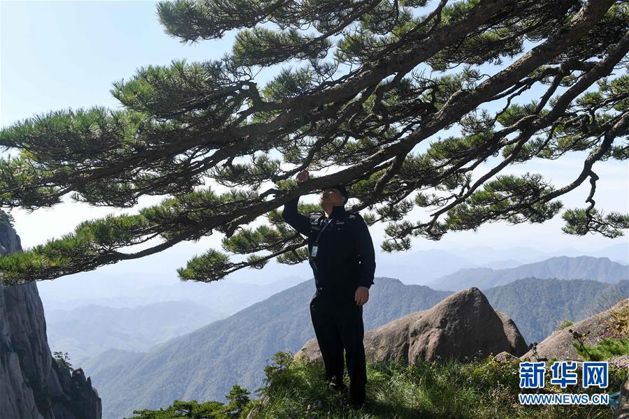 10月1日,安徽黃山風(fēng)景區(qū)管委會(huì)園林局迎客松專職守護(hù)人胡曉春在對(duì)迎客松進(jìn)行巡查。當(dāng)日是國慶節(jié),許多勞動(dòng)者堅(jiān)守在工作一線,在崗位上度過節(jié)日。新華社記者張端攝