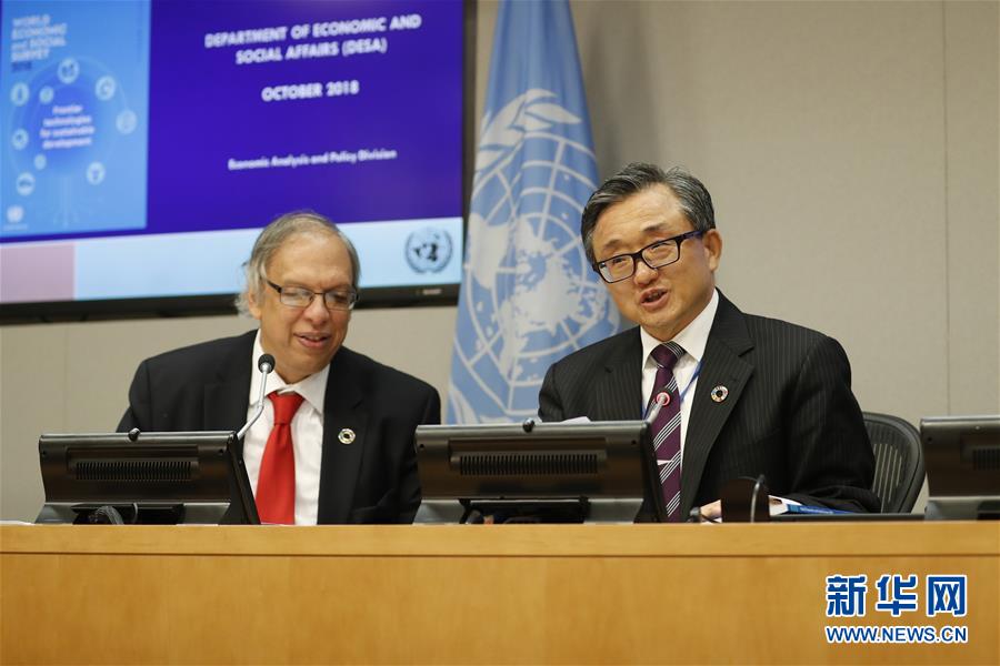 10月8日,在位于紐約的聯(lián)合國總部,聯(lián)合國負(fù)責(zé)經(jīng)濟(jì)和社會事務(wù)的副秘書長劉振民(右)向記者介紹《2018年世界經(jīng)濟(jì)和社會概覽》。 新華社記者李木子攝
