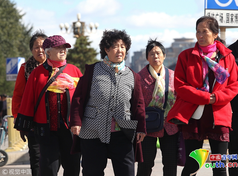 中國(guó)青年網(wǎng)北京10月10日電 2018年10月9日,北京,游客紛紛著秋冬裝游覽天安門(mén)廣場(chǎng)。當(dāng)天北京冷空氣來(lái)襲。圖片來(lái)源:視覺(jué)中國(guó)