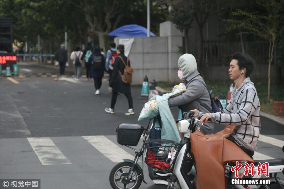 2018年10月9日,山東濟南,昨日一場秋雨過后開始降溫,今天清晨最低氣溫只有6度,馬路上不少上班族穿上羽絨服騎車趕上班路。 圖片來源:視覺中國