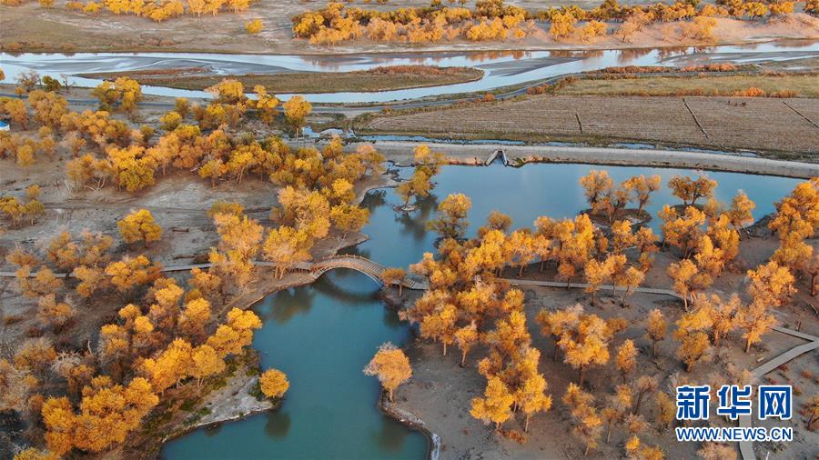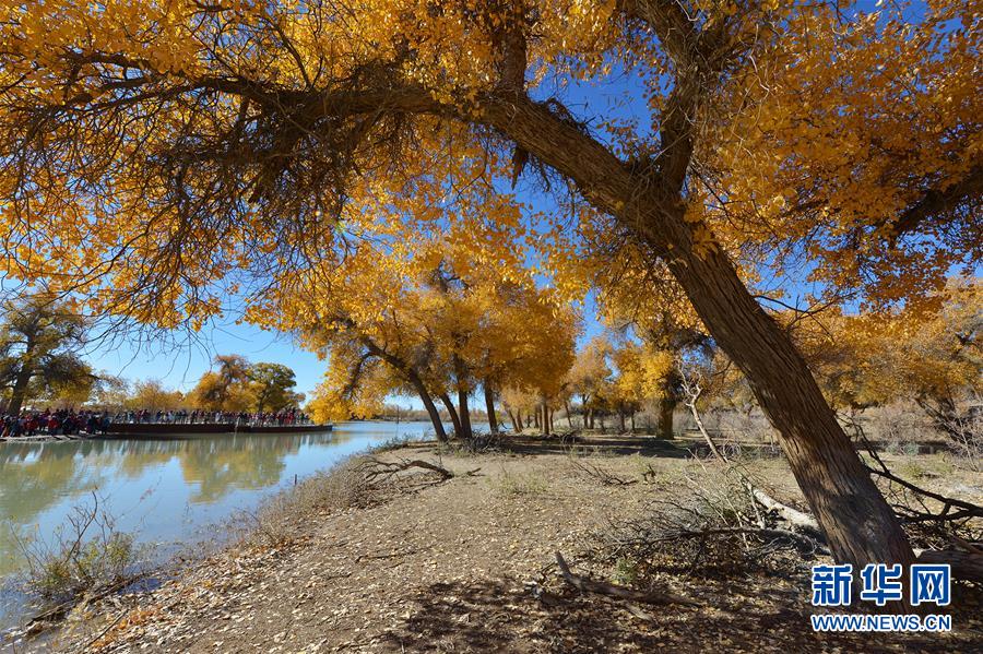 大片的胡楊樹葉由綠變黃,一眼望去,陽光下金色的樹葉襯著湛藍(lán)的天空于風(fēng)中婆娑起舞。