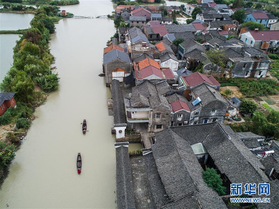 10月10日,泉家潭村村民劃著小船經(jīng)過沿河長廊(無人機拍攝)。經(jīng)過改造提升后,沿河長廊和整潔的古村街巷成為當?shù)孛利愢l(xiāng)村的景觀帶。 新華社記者 徐昱 攝