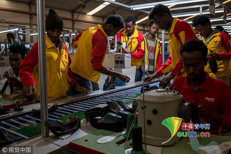 華堅鞋廠的制鞋流水線。據(jù)華堅集團(tuán)官網(wǎng)介紹,每年約240萬雙包括NineWest、GUESS 在內(nèi)的品牌女鞋帶著“Made In Ethiopia”(埃塞俄比亞制造)的標(biāo)簽,從這里流向美國市場。