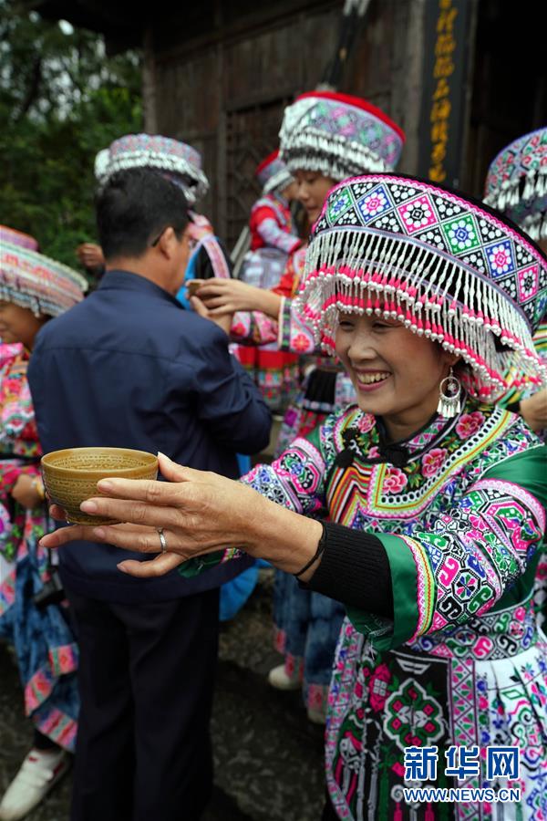 10月14日,在興文石海世界地質(zhì)公園內(nèi),工作人員為遠(yuǎn)道而來的游客敬酒。