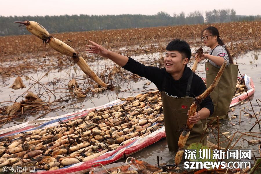 深圳新聞網(wǎng)訊 2018年10月14日,在江蘇宿遷泗洪縣曹廟鄉(xiāng)瓦廟村藕蝦共作基地,一場(chǎng)以藕為主題的慶祝豐收活動(dòng)正在舉行。充滿農(nóng)趣的挖蓮藕、選藕王、挑蓮藕、切藕片等比賽活動(dòng),吸引當(dāng)?shù)剞r(nóng)民積極踴躍參與,切身感受到了豐收帶來的喜悅。
