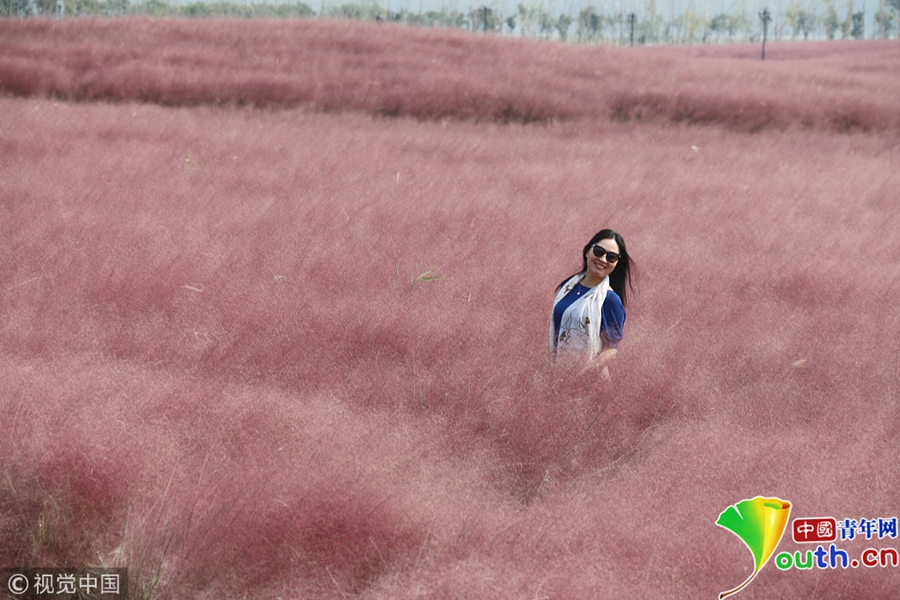 中國青年網(wǎng)北京10月7日電 2018年10月6日,游客在“粉色田野”里游玩、留影。粉黛亂子草是一種觀賞草種,該植物夏季為主要生長季,全株綠色,花期為9月中旬至11月中旬,開花時,綠葉為底,粉紫色花穗如發(fā)絲從基部長出,遠(yuǎn)看如紅色云霧。