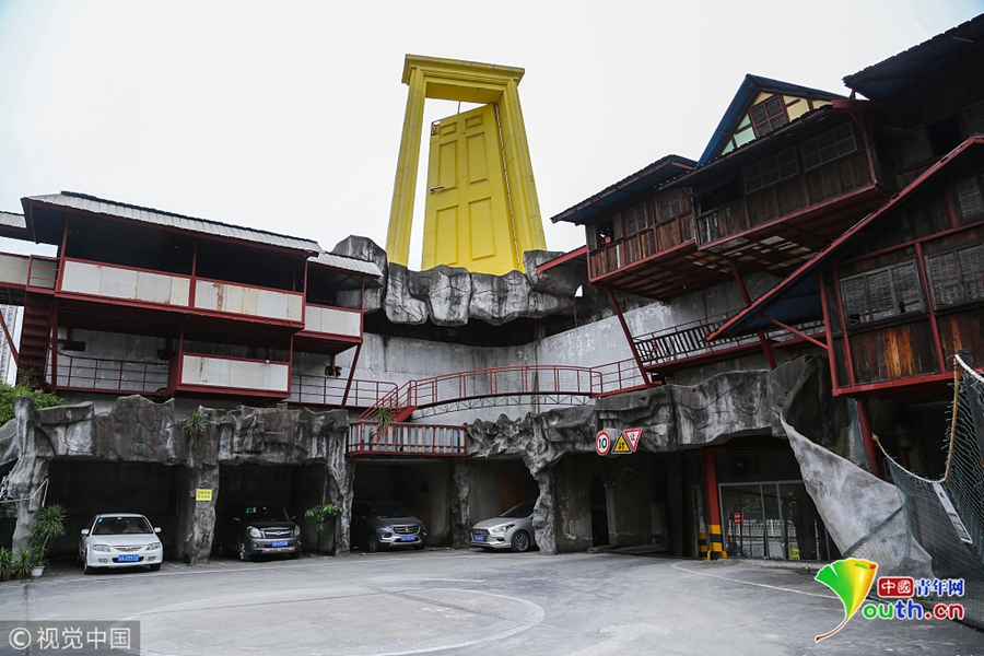 2018年10月12日,在重慶南岸區(qū)海峽路,一棟房屋頂部懸立著的一扇巨型金色大門(mén),高約8米,被過(guò)往民眾戲稱(chēng)為“上帝之門(mén)”。圖片來(lái)源:視覺(jué)中國(guó)