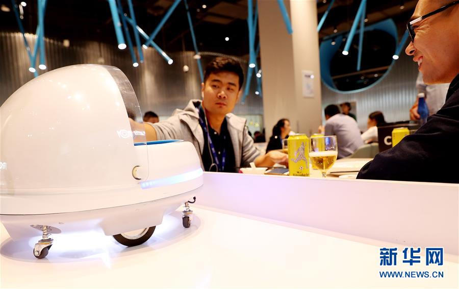 10月15日,顧客從送餐機器人的裝載平臺上取下菜品。 新華社記者 方喆 攝