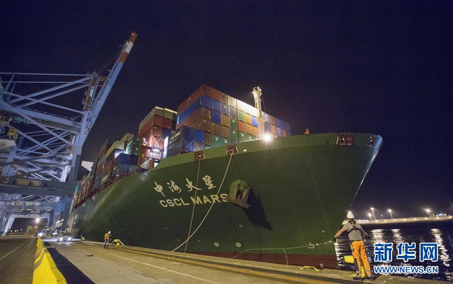 10月15日晚,中遠海運旗下的“中海火星”號集裝箱輪??吭诒壤麜r澤布呂赫港集裝箱碼頭。 新華社記者 葉平凡 攝