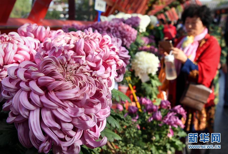 10月17日,游客在開封清明上河園內拍攝展出的菊花。重陽時節(jié),各色菊花競相綻放,把古都開封裝點得分外秀美,吸引眾多游客前來觀賞游玩。 新華社記者 李安 攝