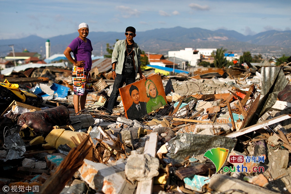 當(dāng)?shù)貢r(shí)間2018年10月7日,印尼帕盧,兩名男子從地震廢墟中找回他們?nèi)ナ栏改傅漠嬒?。圖片作者:JORGE SILVA/視覺中國