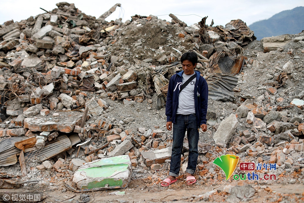 當(dāng)?shù)貢r(shí)間2018年10月11日,印尼帕盧,43歲的農(nóng)民Ahmad在廢墟旁邊,這里曾經(jīng)是他的家。他希望能找到妻子和兩個(gè)女兒的遺體。他的三女兒被發(fā)現(xiàn)時(shí)受了重傷,現(xiàn)在正在醫(yī)院接受治療。