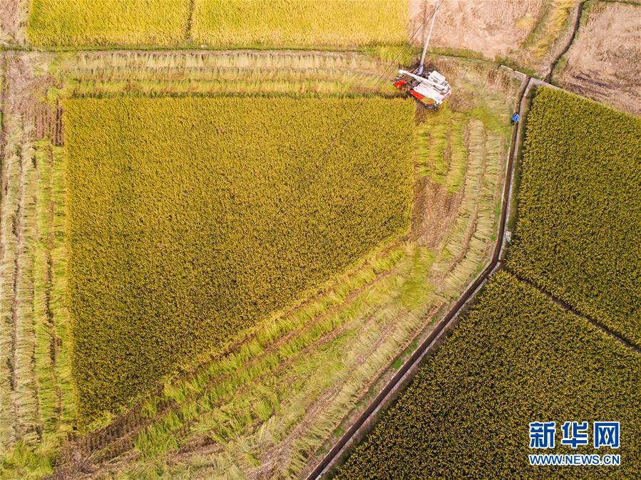 10月17日,工作人員操作收割機收割水稻(無人機拍攝)。 新華社記者 徐昱 攝