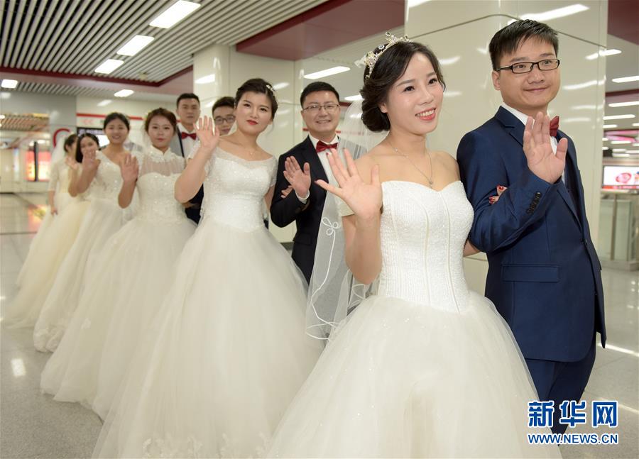 10月18日,在合肥市地鐵一號線,新人們準備乘坐地鐵。當日,中鐵四局集團城市軌道交通工程分公司的18對新人在安徽合肥地鐵一號線的車廂里舉行了一場集體婚禮儀式。 新華社記者 郭晨 攝