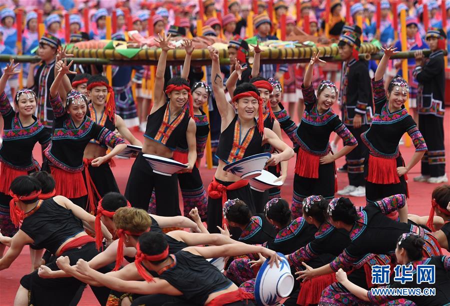 10月20日,各族同胞在廣西大化瑤族自治縣江濱文化廣場表演節(jié)目,慶??h慶?! ⌒氯A社記者陸波岸攝
