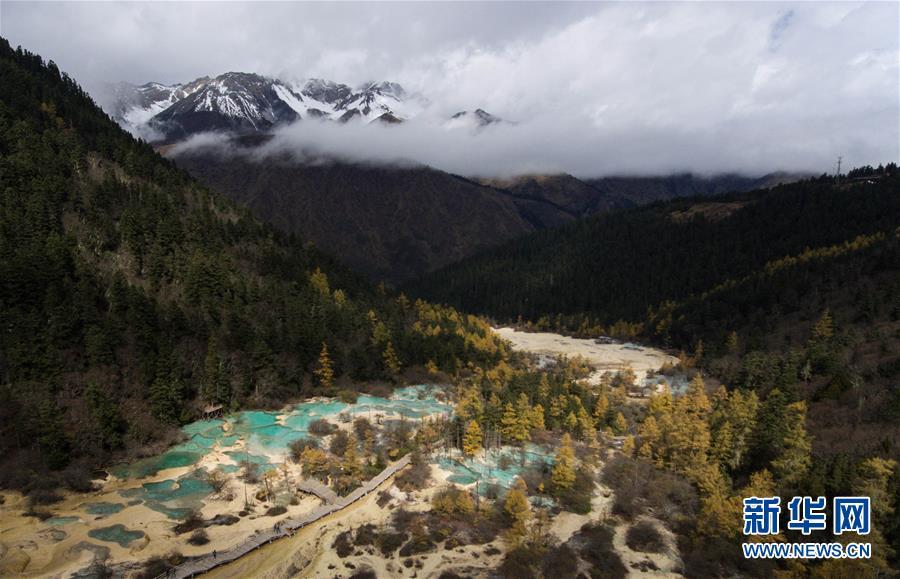 雪山、彩林、彩池構(gòu)成一幅色彩斑斕的畫卷(10月19日無人機拍攝)。深秋時節(jié),在雪山、藍天、白云和彩林映襯下,黃龍溝中的彩池色彩更加斑斕,目前黃龍景區(qū)進入觀賞最佳時節(jié)。黃龍風景名勝區(qū)位于四川省松潘縣境內(nèi),以彩池、灘流、雪山、峽谷、森林等聞名,享有“人間瑤池”“圣地仙境”之美譽。新華社記者 江宏景攝