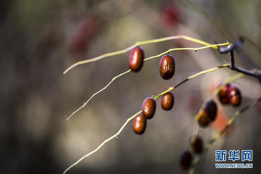 10月20日,在且末縣阿熱勒鎮(zhèn)有機紅棗園里,成熟的紅棗掛在枝頭。 新華社記者 趙戈 攝