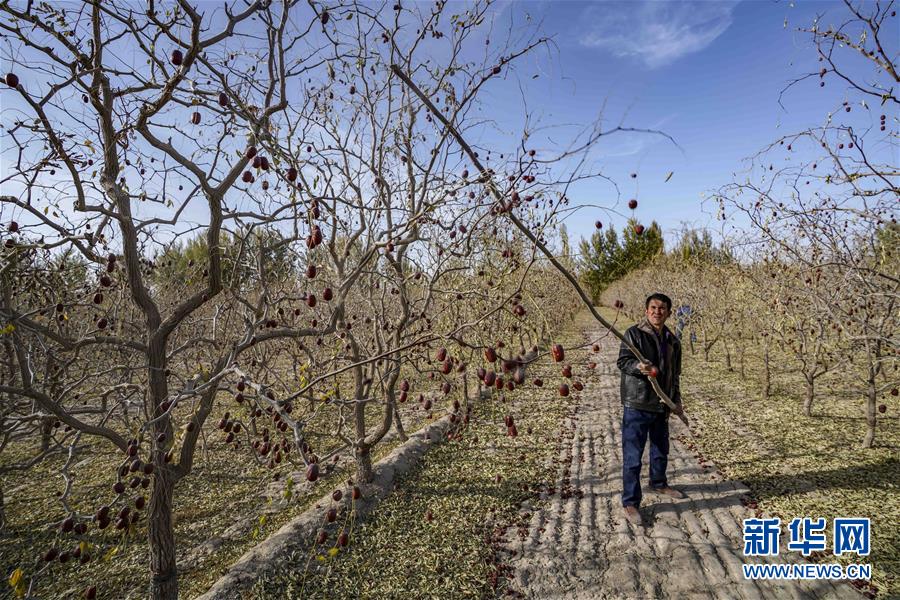 10月20日,在且末縣阿熱勒鎮(zhèn)有機紅棗園里,棗農(nóng)在撿拾成熟的紅棗。  新華社記者 趙戈 攝