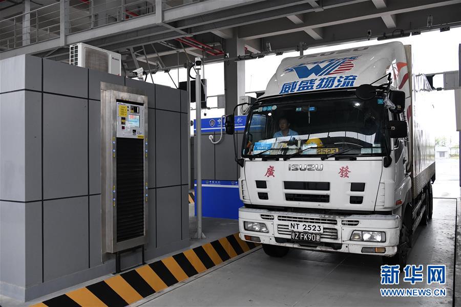 這是貨運車輛在進行模擬通關(10月17日攝)。 新華社記者 梁旭 攝