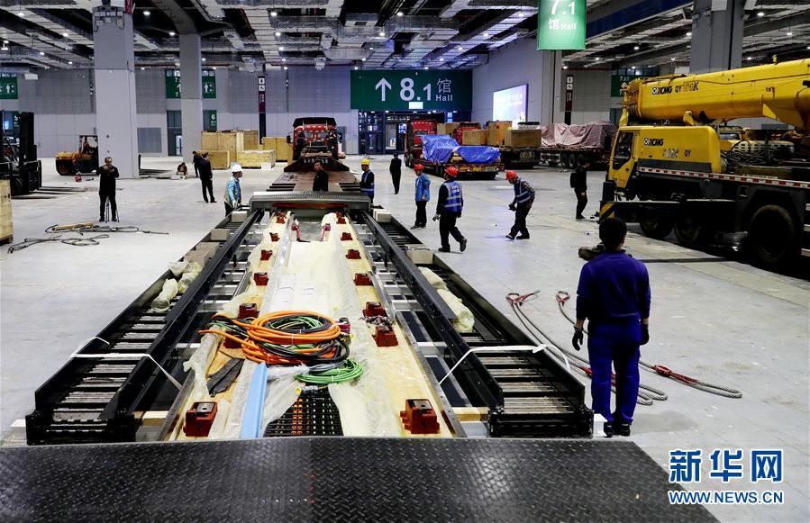 10月22日,“金牛座”龍門(mén)銑床床身(前)等待裝運(yùn)。 當(dāng)日,來(lái)自德國(guó)的首屆進(jìn)口博覽會(huì)最大展品——“金牛座”龍門(mén)銑床完成初步組裝,將運(yùn)往國(guó)家會(huì)展中心(上海)3號(hào)館進(jìn)行最后的安裝施工。這是德國(guó)瓦德里??票す狙邪l(fā)的機(jī)床設(shè)備,高約8米,占地面積約200平方米,將在智能及高端裝備區(qū)進(jìn)行展出。 新華社記者方喆攝