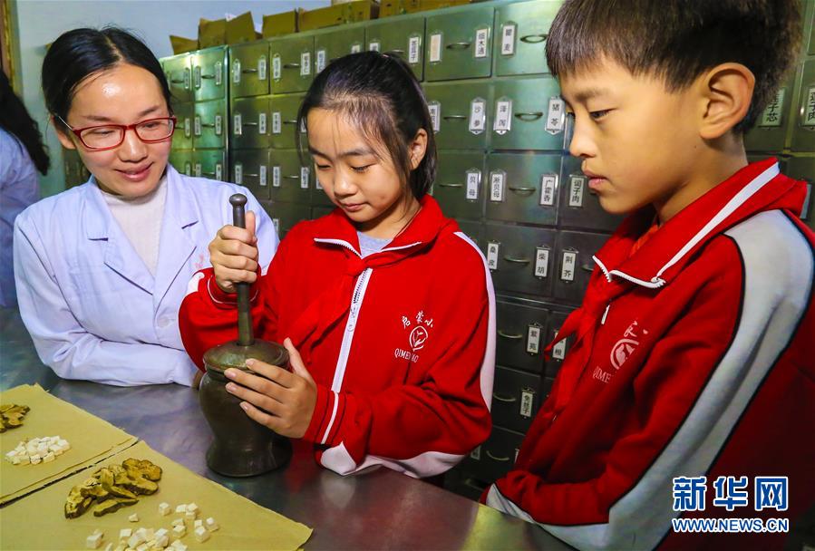 10月22日,安平縣啟蒙小學(xué)學(xué)生在安平縣中醫(yī)院醫(yī)生的指導(dǎo)下體驗用傳統(tǒng)工具加工中草藥。 當日是世界傳統(tǒng)醫(yī)藥日,河北省安平縣啟蒙小學(xué)組織學(xué)生走進安平縣中醫(yī)院,通過參觀中藥房、認識常見中藥、感受中藥加工等方式,向小學(xué)生普及中醫(yī)藥知識,弘揚傳統(tǒng)中醫(yī)藥文化。 新華社記者李曉果攝