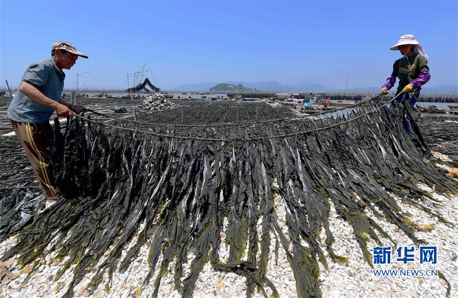 5月17日,在霞浦縣沙江鎮(zhèn)沙江村碼頭,養(yǎng)殖戶(hù)在晾曬海帶。