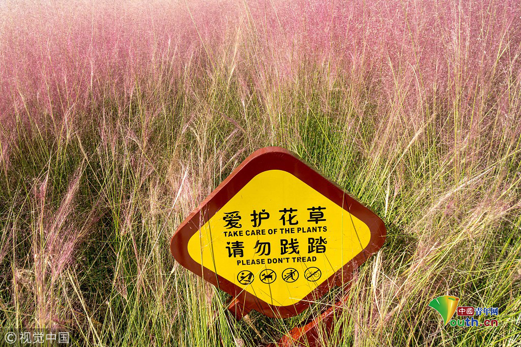 當(dāng)?shù)貢r(shí)間2018年10月16日,韓國(guó)蔚山,近日,蔚山公園大片粉黛亂子草盛開(kāi),粉紅花海浪漫十足,但部分花海遭游客隨意踩踏。公園并沒(méi)有修復(fù)遭破壞區(qū)域,而是用繩索圍起并掛上批判性告示,呼吁游客腳下留情。圖片作者:Yonhap News Agency