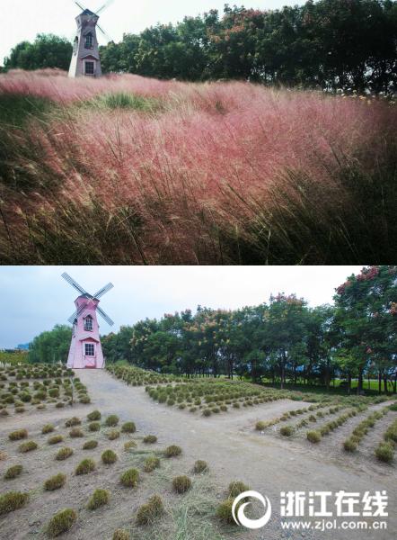 游客在生態(tài)樂(lè)園粉黛亂子草中的風(fēng)車。