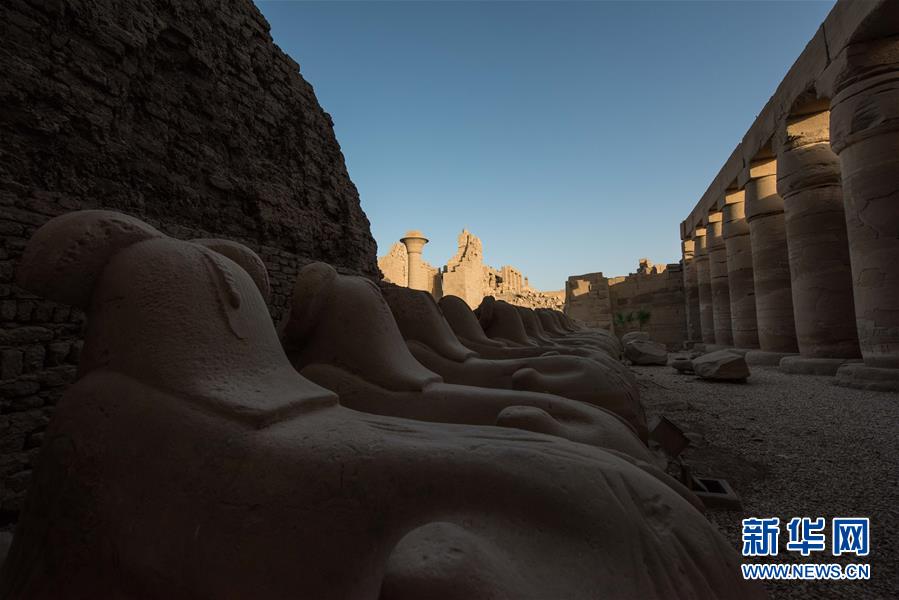 這是10月23日在埃及盧克索拍攝的卡納克神廟內(nèi)的石像。新華社記者 孟濤 攝