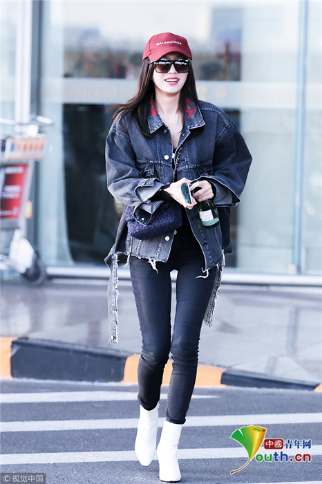 2018年10月24日,北京,“富察皇后”秦嵐現(xiàn)身機(jī)場。她頭戴小紅帽,身穿黑色緊身褲顯美腿筆直修長,上身穿著牛仔外套青春逼人,邊走邊甜笑玩“撩發(fā)殺”,靚麗吸睛。