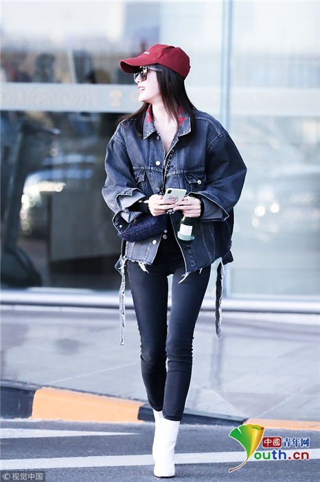 2018年10月24日,北京,“富察皇后”秦嵐現(xiàn)身機(jī)場。她頭戴小紅帽,身穿黑色緊身褲顯美腿筆直修長,上身穿著牛仔外套青春逼人,邊走邊甜笑玩“撩發(fā)殺”,靚麗吸睛。