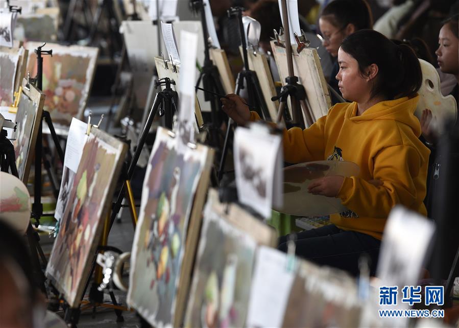 10月24日,考生在南京青藍(lán)畫(huà)室教學(xué)基地考點(diǎn)參加色彩科目模擬考試。 新華社記者孫參攝