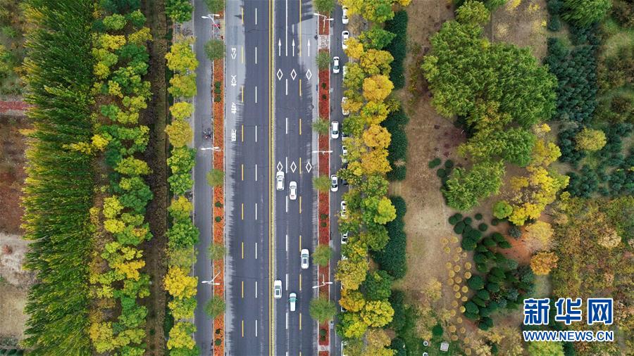 寧夏銀川市鳳凰公園秋景(10月20日無人機拍攝)。