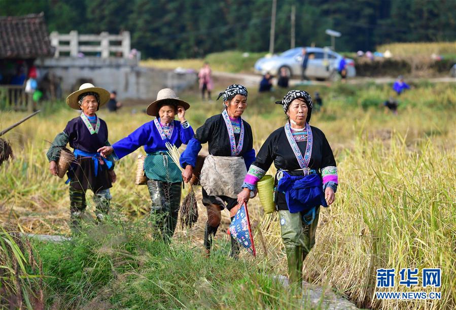 10月30日,在廣西融水苗族自治縣安太鄉(xiāng)元寶村,村民走在田間,準備收獲香糯。