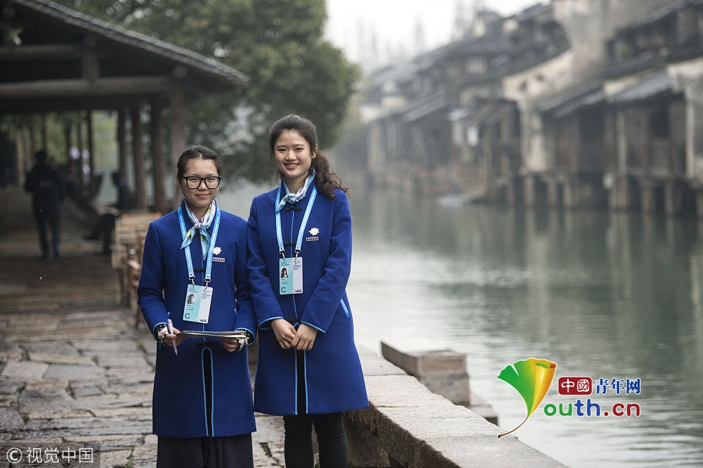 2015年12月13日,浙江嘉興,桐鄉(xiāng)烏鎮(zhèn)景區(qū),引導志愿者著裝上崗,她們將在景區(qū)各個站點開展引導咨詢服務。