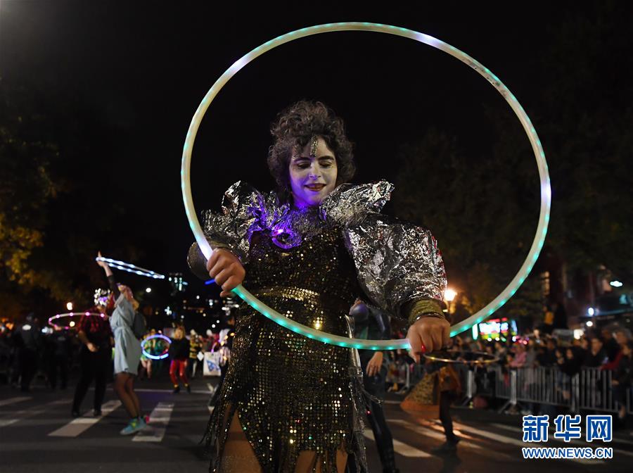 10月31日,在美國(guó)紐約曼哈頓,一名男子參加萬(wàn)圣節(jié)大游行。