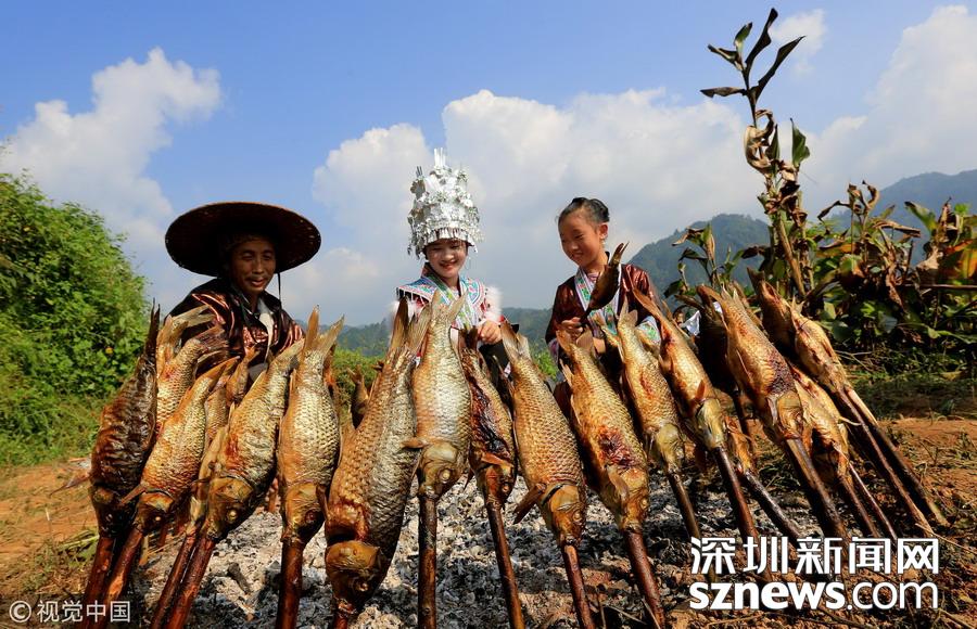 深圳新聞網(wǎng)訊 2018年9月15日,廣西柳州市融水苗族自治縣喜迎中國首屆“農(nóng)民豐收節(jié)”——2018金秋燒魚季啟動儀式在桿洞鄉(xiāng)花孖苗寨舉行,數(shù)百名苗族群眾和游人共同開展了水田拔河、田間捉魚、傳統(tǒng)打谷和燒魚等活動,慶祝豐收。
