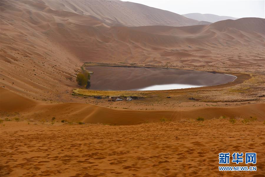 陰雨中的沙漠湖泊,常常讓人以為是一面鏡子(10月18日攝)。 巴丹吉林沙漠位于內(nèi)蒙古西部阿拉善盟,是中國(guó)第三大沙漠,沙丘起伏的曲線(xiàn)陡變成高聳的沙山,碧藍(lán)的湖泊散落在沙海間。 新華社記者 李仁虎 攝