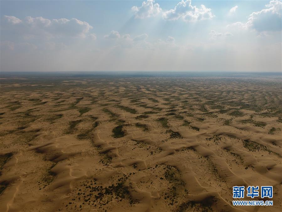 內(nèi)蒙古杭錦旗沙日召嘎查牧民白音道爾計(jì)治理過(guò)的庫(kù)布其沙漠(7月31日無(wú)人機(jī)拍攝)。 新華社記者邢廣利攝