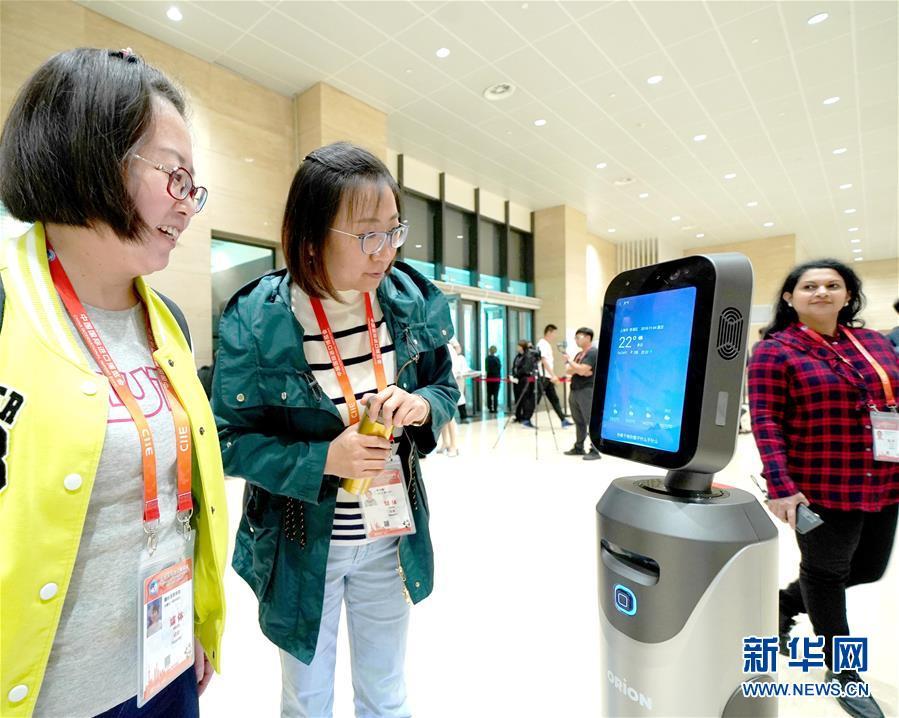 11月4日,媒體記者在首屆中國國際進口博覽會新聞中心和引導(dǎo)機器人互動。 新華社記者陳建力攝